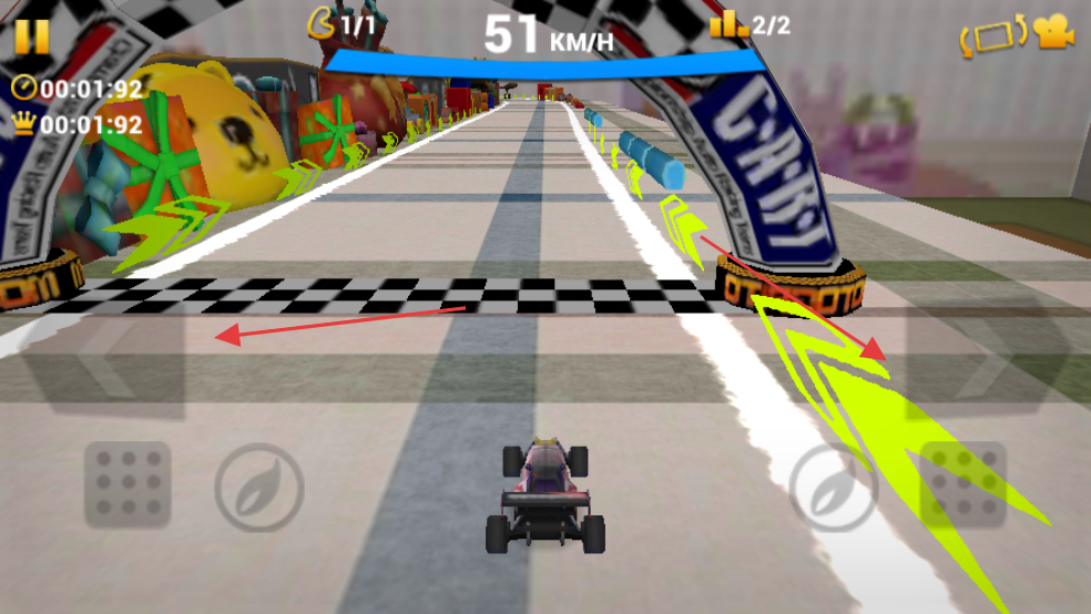 1、比賽中使用左右方向按鈕操控卡丁車轉(zhuǎn)向,在賽道上沿黃色箭頭指示的路徑行駛,保持速度和方向。