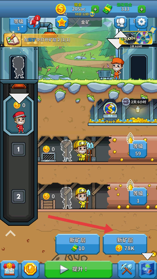 1、消耗現(xiàn)金解鎖【新礦層】,如【78K】現(xiàn)金解鎖的礦層,拓展采礦區(qū)域,提升資源獲取量。
