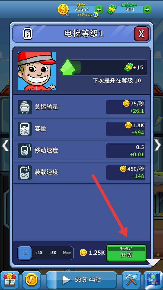 2、在電梯升級界面,點擊【升等】按鈕,提升電梯等級,如【電梯等級1】,增加總運輸量、容量等屬性。
