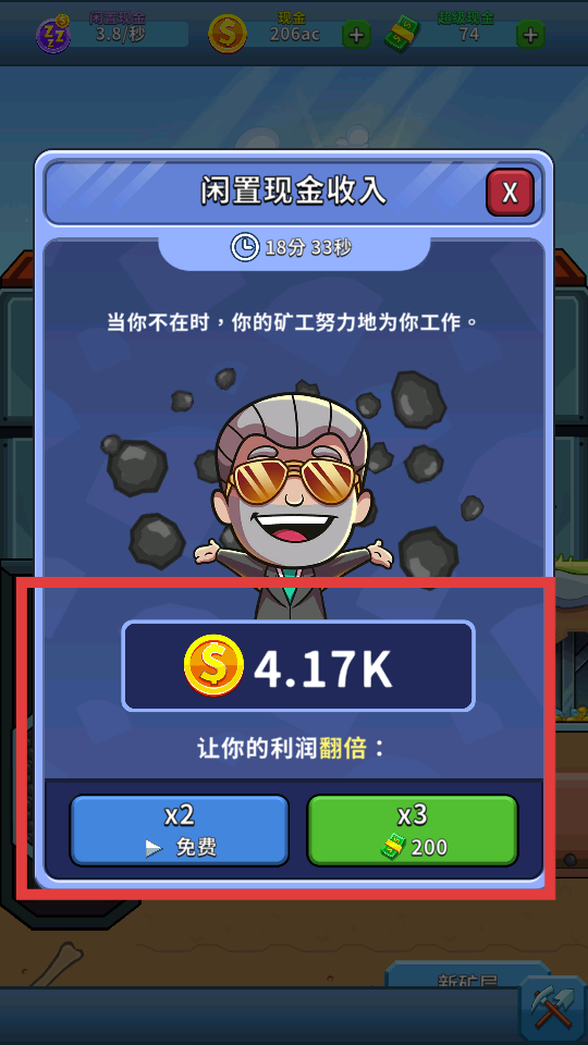 4、領取【閑置現(xiàn)金收入】,如【4.17K】現(xiàn)金,利用免廣告優(yōu)勢選擇免費翻倍利潤,快速積累資金,發(fā)展采礦事業(yè)。