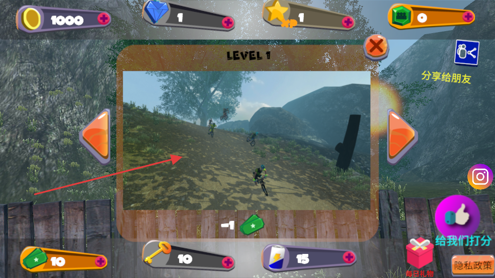 1、進(jìn)入【LEVEL-1】后,準(zhǔn)備操控自行車(chē)在山地賽道上行駛,開(kāi)始競(jìng)速挑戰(zhàn)。