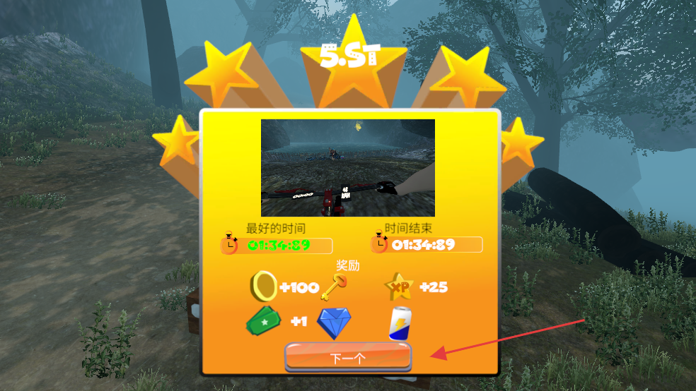 4、完成關(guān)卡后點(diǎn)擊【下一個(gè)】按鈕,繼續(xù)挑戰(zhàn)后續(xù)關(guān)卡,獲取金幣、鉆石等獎(jiǎng)勵(lì),提升自行車(chē)性能。