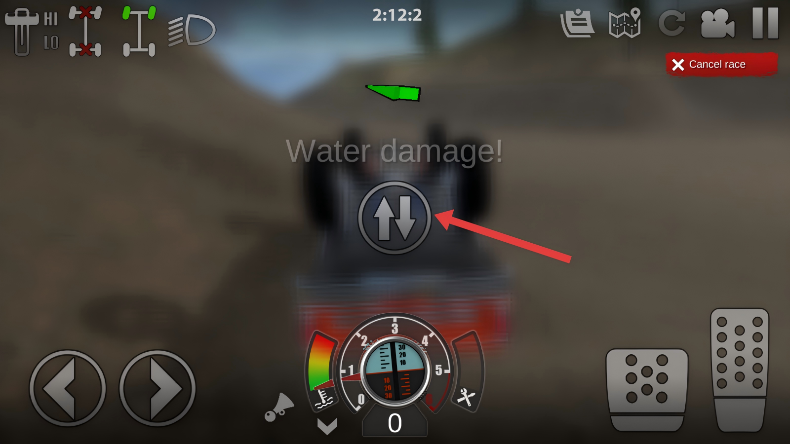 4、若車輛出現(xiàn)【W(wǎng)ater-damage】提示,點擊中間上下箭頭按鈕應(yīng)對,及時操作可避免車輛故障,繼續(xù)越野挑戰(zhàn)。