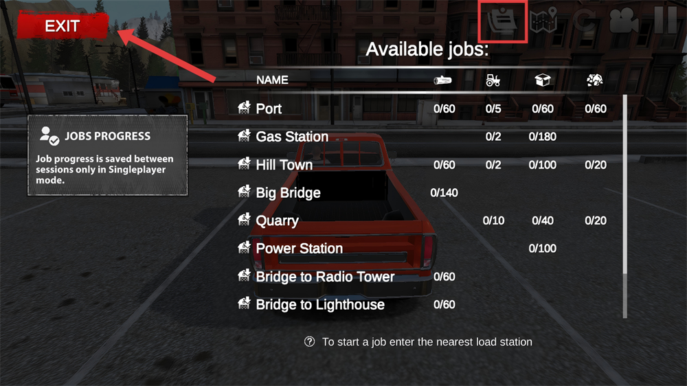 1、進入任務(wù)界面,可查看【Port】等可用任務(wù),若需退出可點擊左上角【EXIT】按鈕,任務(wù)進度僅在單人模式保存。