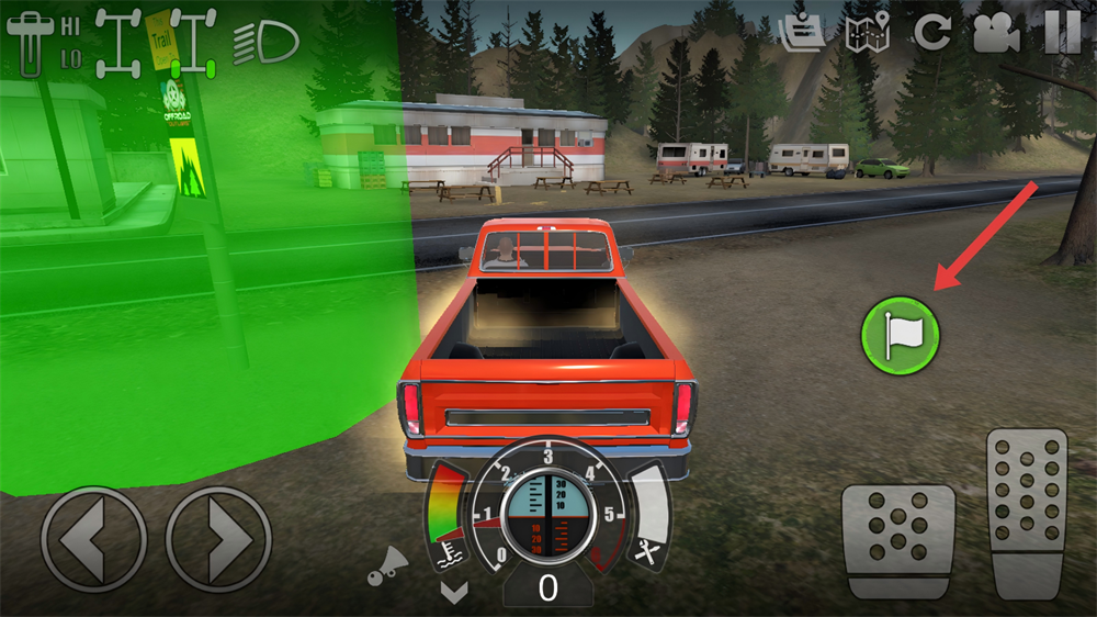 2、在游戲場景中,找到綠色旗幟標識的按鈕并點擊,即可開啟越野任務(wù),駕駛車輛前往目標地點。
