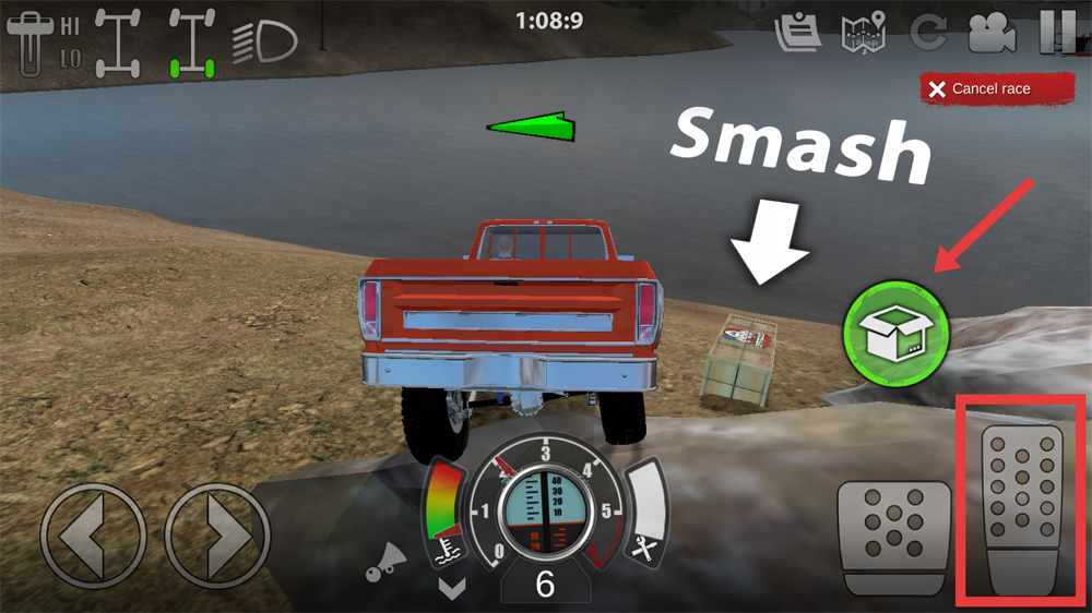3、遇到需撞擊的箱子時,點擊綠色箱子按鈕執(zhí)行【Smash】操作,同時可借助右側(cè)控制鍵調(diào)整車輛,順利完成任務(wù)環(huán)節(jié)。