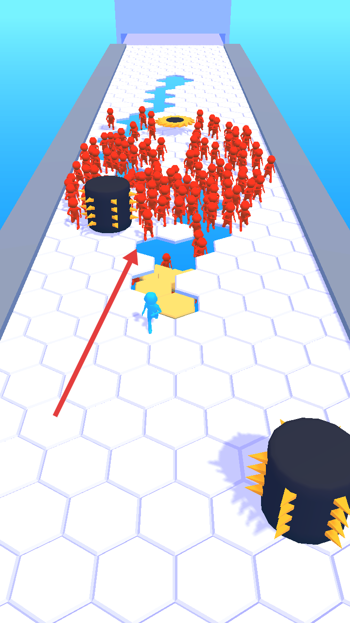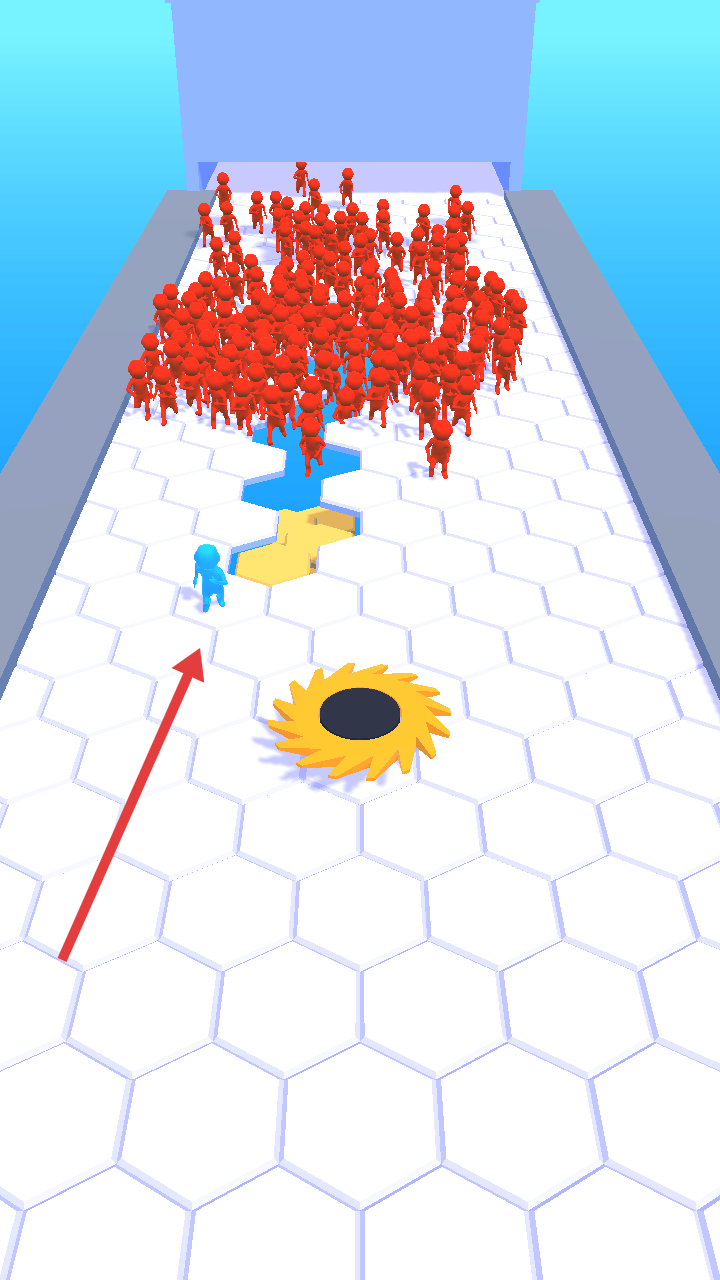 2、在賽道上靈活移動,利用路徑優(yōu)勢避開紅色人群的包圍,同時注意躲避旋轉(zhuǎn)的黑色帶刺障礙物。