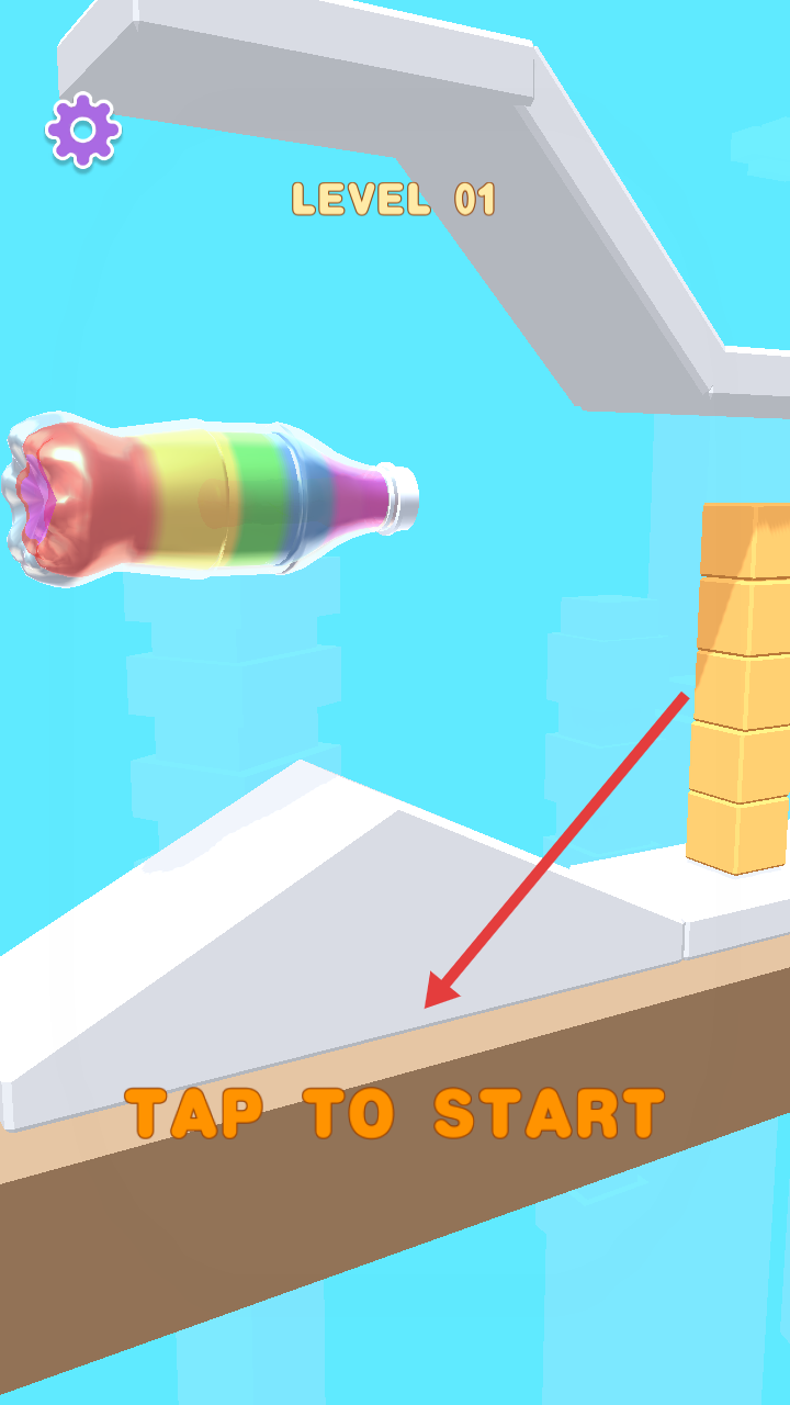 1、點(diǎn)擊TAPTOSTART,操控彩虹色瓶子在賽道上開(kāi)始游戲,需利用坡道和障礙物的彈射作用前進(jìn)。