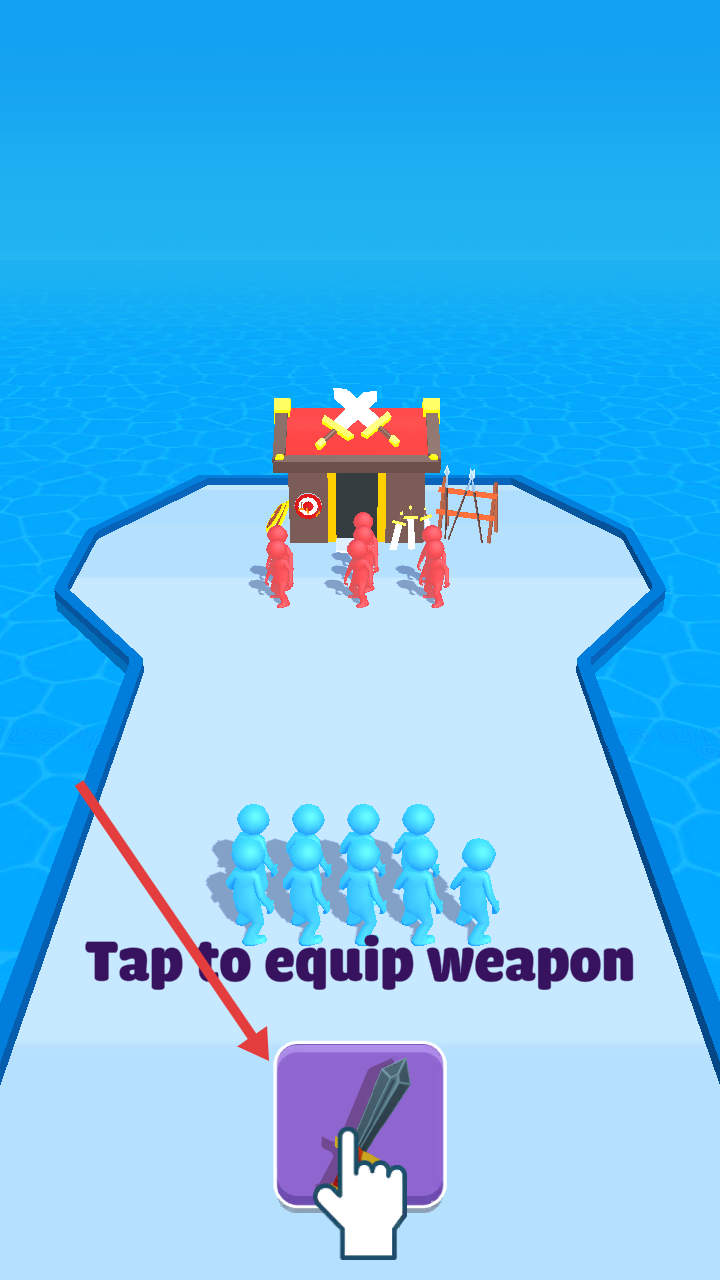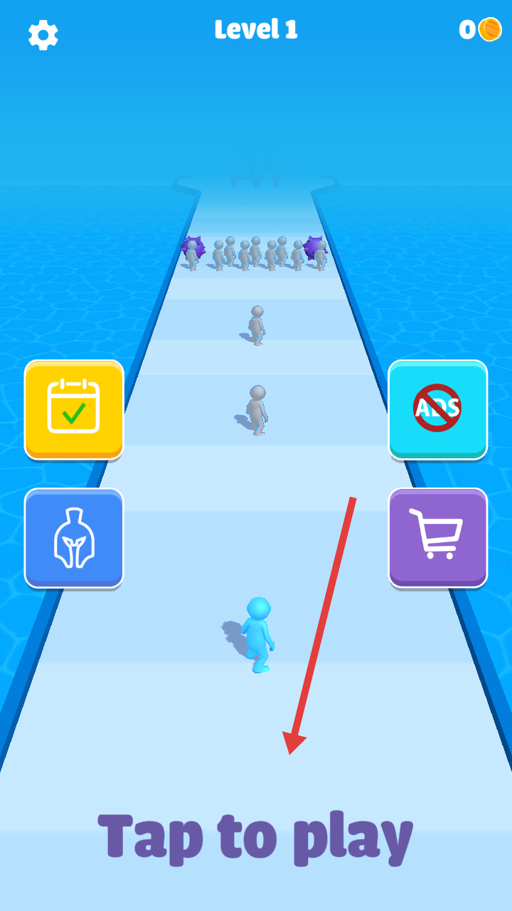 1、點(diǎn)擊Taptoplay,操控藍(lán)色角色在海上賽道開(kāi)始游戲,需收集灰色角色壯大隊(duì)伍,躲避紫色障礙物。
