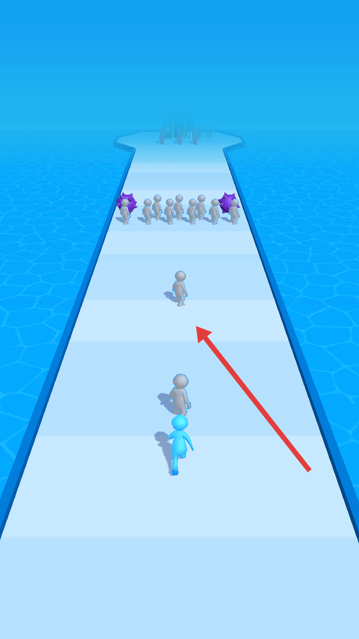 2、在賽道上,不斷收集灰色角色增加隊(duì)伍規(guī)模,同時(shí)注意避開(kāi)兩側(cè)的紫色障礙物,保持隊(duì)伍前進(jìn)。