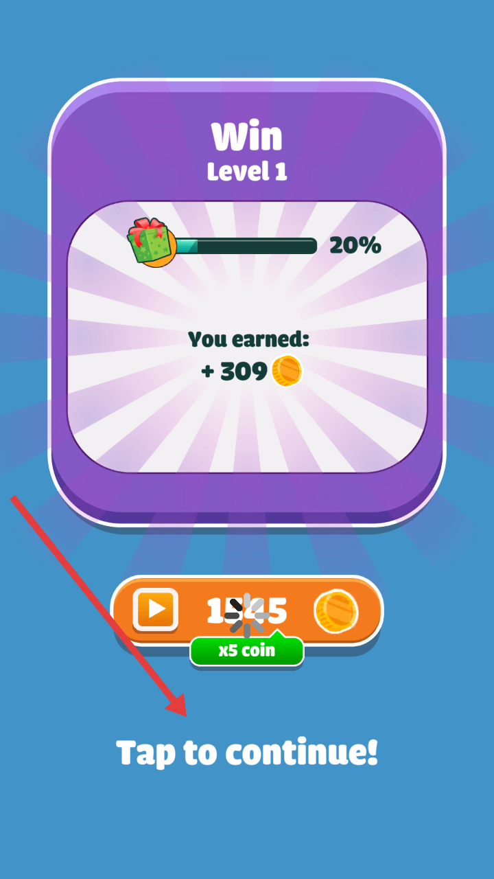 4、通關(guān)后,點(diǎn)擊Taptocontinue領(lǐng)取金幣,如+309,用于升級(jí)隊(duì)伍或解鎖新內(nèi)容,繼續(xù)挑戰(zhàn)下一關(guān)。