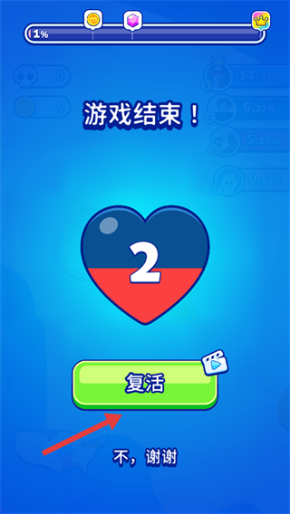 4、游戲結(jié)束時(shí),可選擇復(fù)活繼續(xù)游戲,免廣告版無需觀看廣告即可快速復(fù)活,持續(xù)參與競爭。