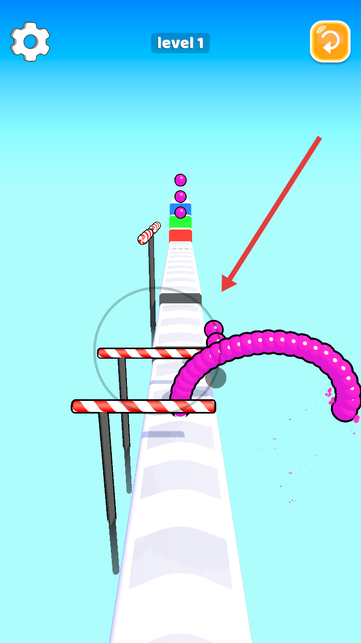 3、避開(kāi)賽道上的障礙物,通過(guò)紅白欄桿等區(qū)域,合理規(guī)劃路徑,確保粉色長(zhǎng)條順利向終點(diǎn)推進(jìn)。