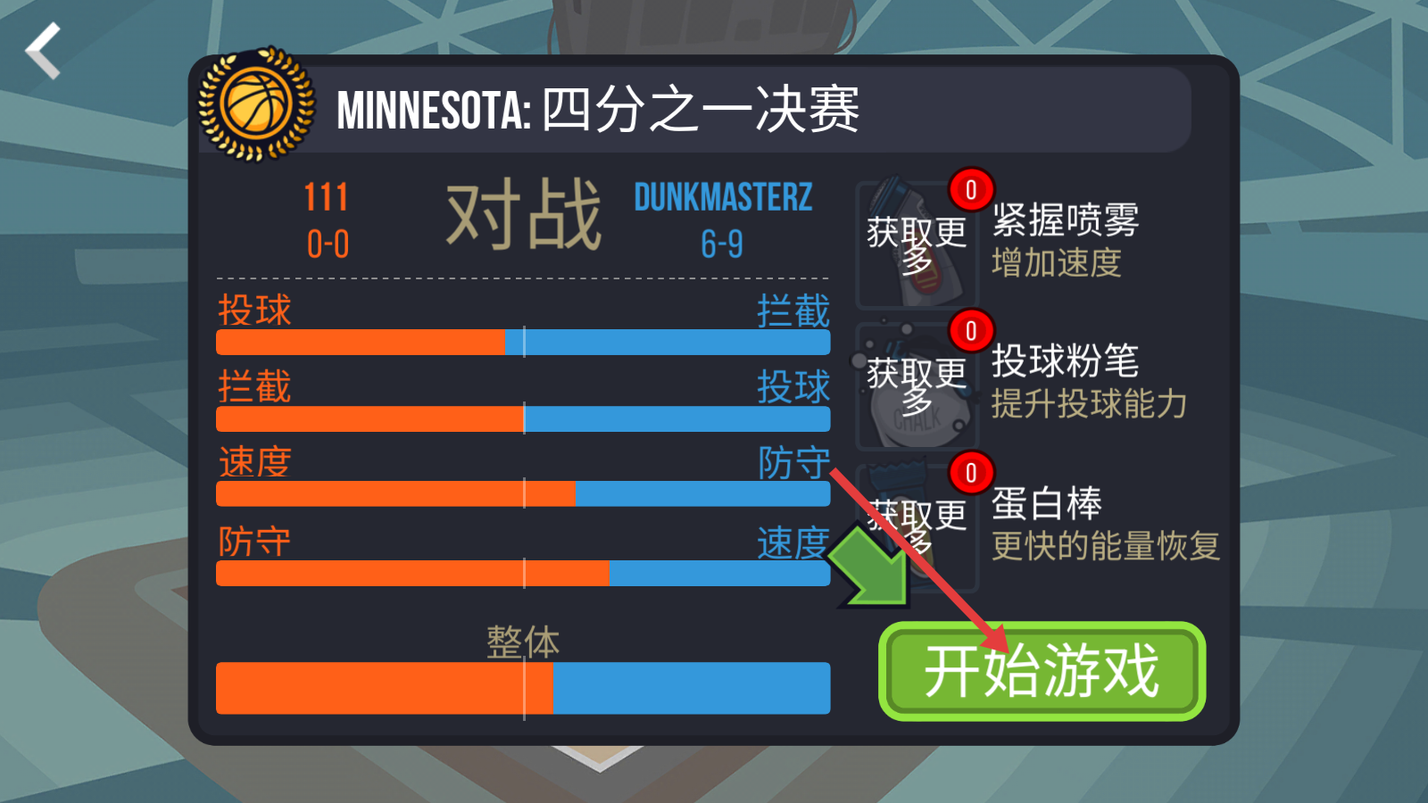 1、進入【MINNESOTA:四分之一決賽】對戰(zhàn)【DUNKMASTERZ】前,查看投球、攔截等屬性后,點擊【開始游戲】進入比賽。