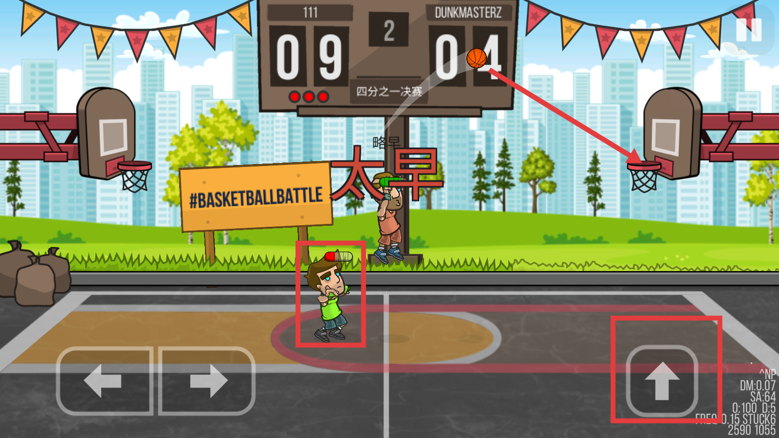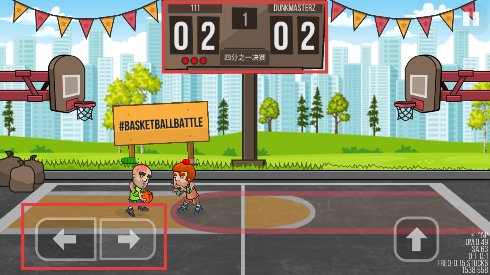 2、比賽中,利用左下角左右箭頭按鈕控制角色移動,爭奪籃球,注意記分牌比分變化。