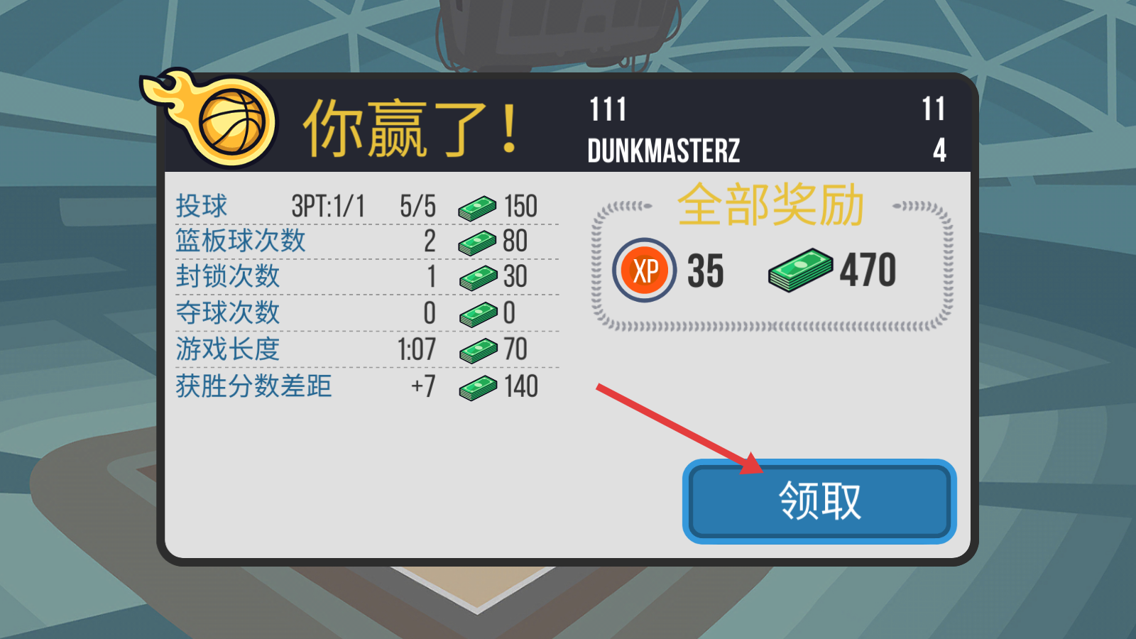 4、比賽獲勝后,可查看投球、籃板球次數(shù)等數(shù)據(jù),點擊【領取】獲取【XP-35】和【470】金幣獎勵。