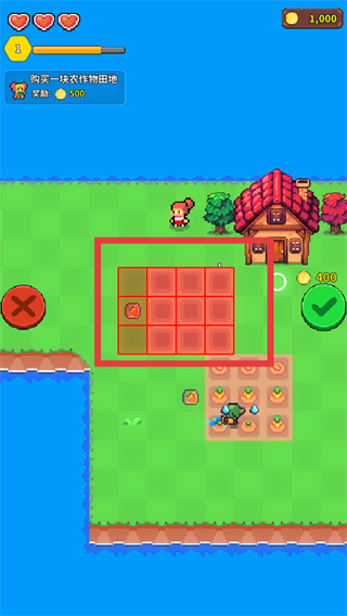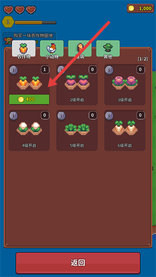 2、花費(fèi)400金幣購(gòu)買農(nóng)作物田地,通過(guò)內(nèi)置菜單可快速解鎖種植區(qū)域,為大規(guī)模耕種奠定基礎(chǔ)。