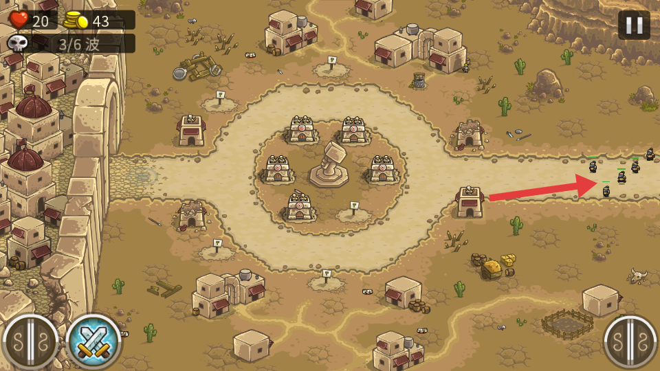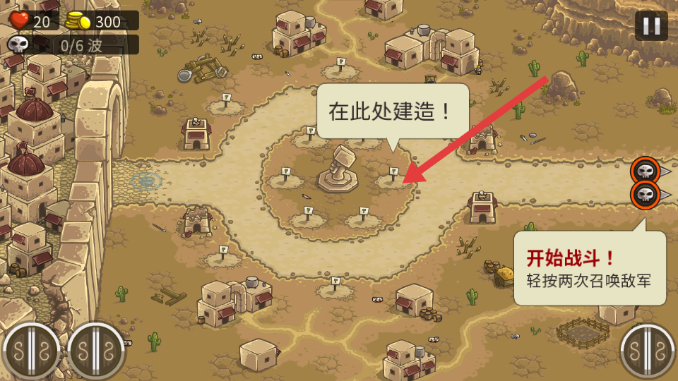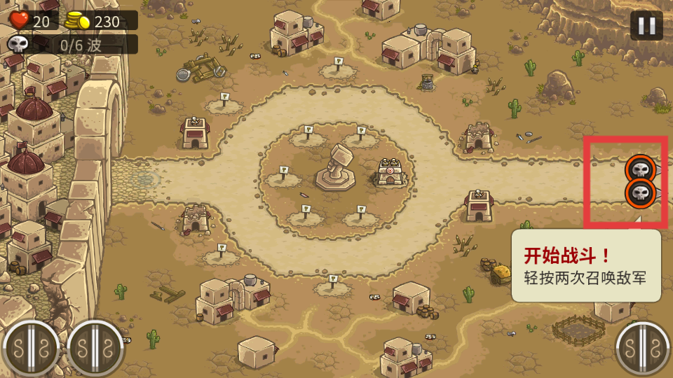 3、輕按兩次敵軍召喚按鈕,觸發(fā)【0/6波】敵軍進攻,觀察敵軍路線,調整防御塔布局。