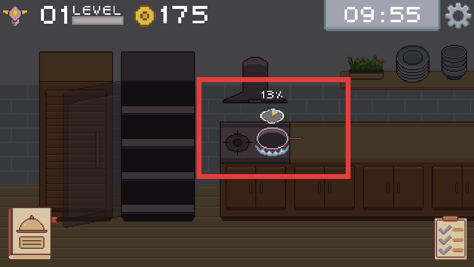 3、在廚房中操作灶臺(tái)烹飪,留意烹飪進(jìn)度【13%】,掌握火候確保菜品烹飪完成度。