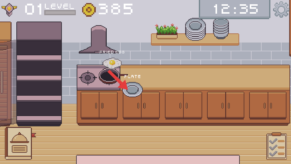 4、將烹飪好的菜品裝盤,如煎蛋放入餐盤,完成菜品制作后交付訂單,獲取金幣升級(jí)廚房設(shè)施。