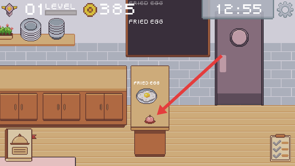 2、將做好的煎蛋放在出餐臺(tái),點(diǎn)擊鈴鐺交付訂單,獲取金幣用于升級(jí)廚房或購(gòu)買食材。