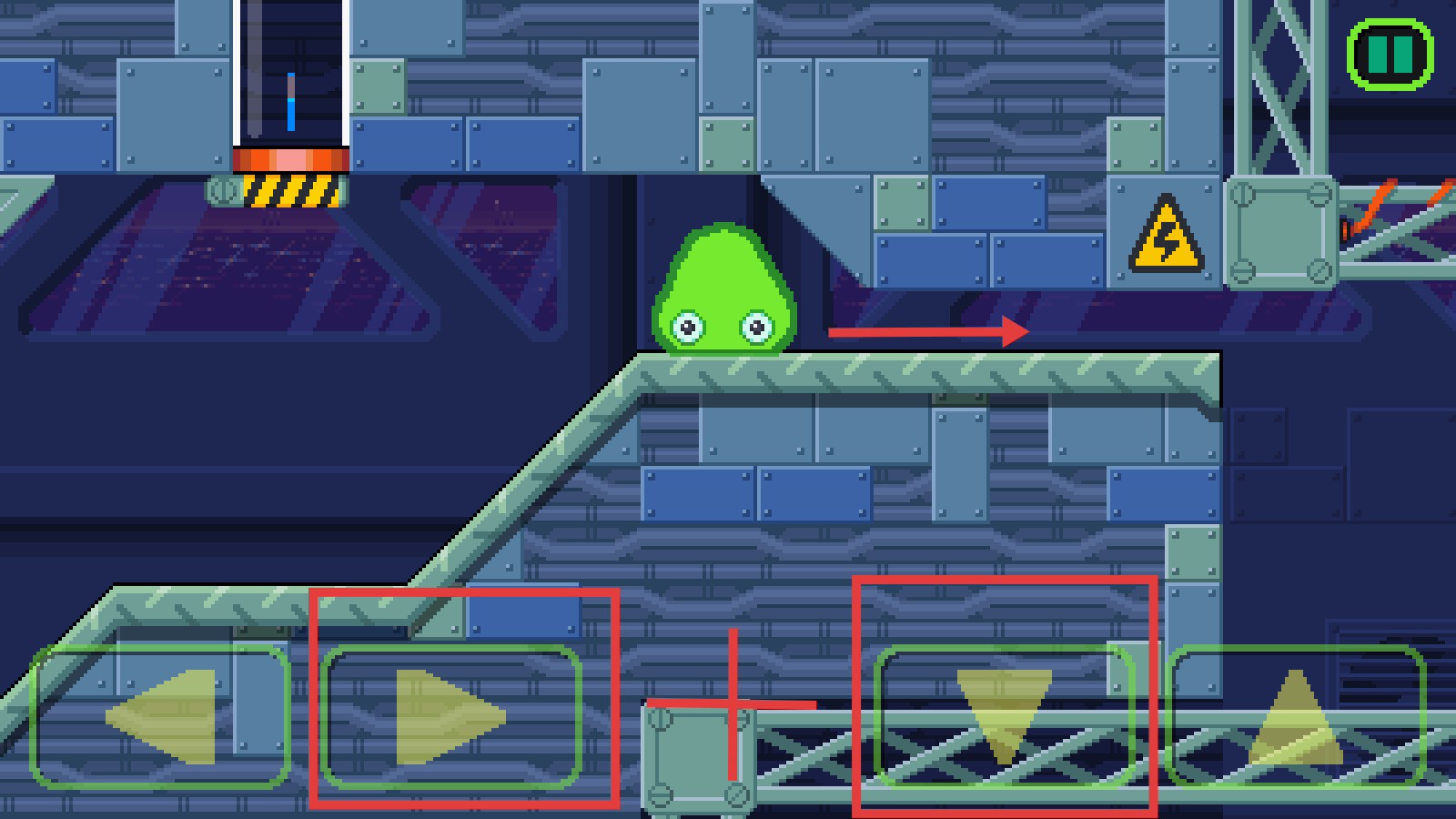 2、游戲中通過(guò)左側(cè)左右箭頭按鈕控制綠色史萊姆移動(dòng),右側(cè)按鈕使其下蹲,在機(jī)械風(fēng)格場(chǎng)景中避開(kāi)危險(xiǎn)區(qū)域,探索前進(jìn)。