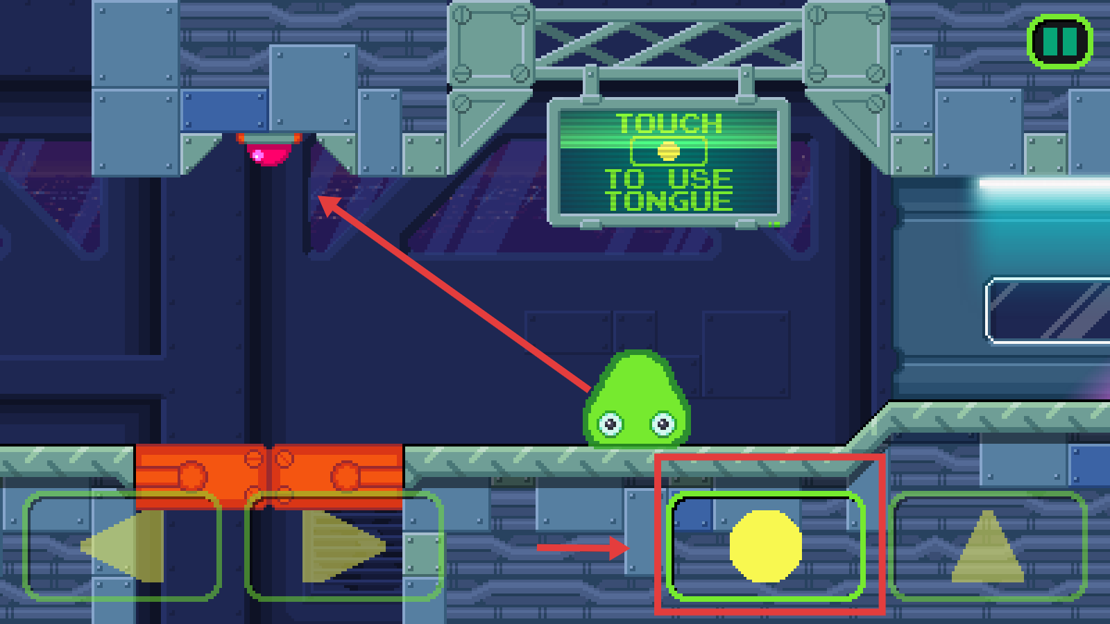 3、遇到可交互物品時(shí),點(diǎn)擊黃色按鈕使用舌頭功能,抓取遠(yuǎn)處物品,如粉色物體,助力通關(guān),同時(shí)留意屏幕提示。