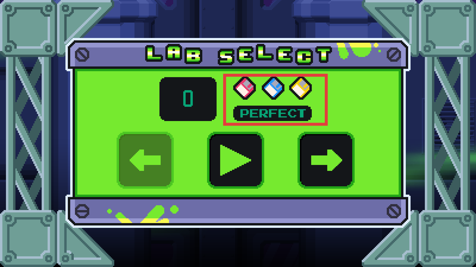 4、關(guān)卡結(jié)束后進(jìn)入【LAB-SELECT】界面,選擇繼續(xù)游戲、切換關(guān)卡或返回菜單,繼續(xù)史萊姆的實(shí)驗(yàn)室冒險(xiǎn)。