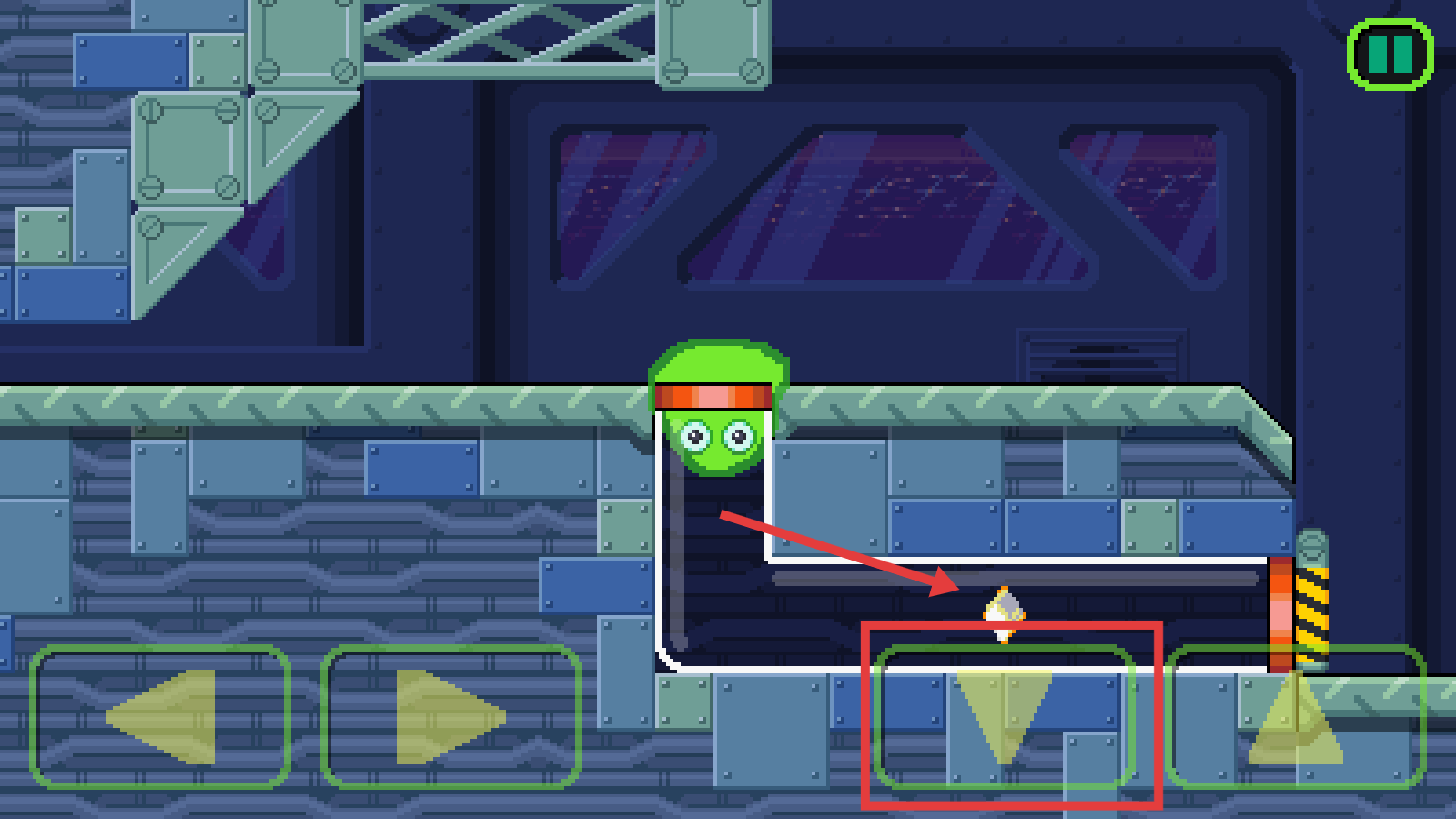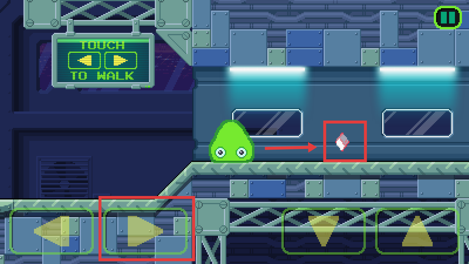 2、通過按鈕控制綠色史萊姆移動(dòng),右側(cè)按鈕使其前進(jìn),在機(jī)械場(chǎng)景中收集紅色菱形物品,留意屏幕操作提示。