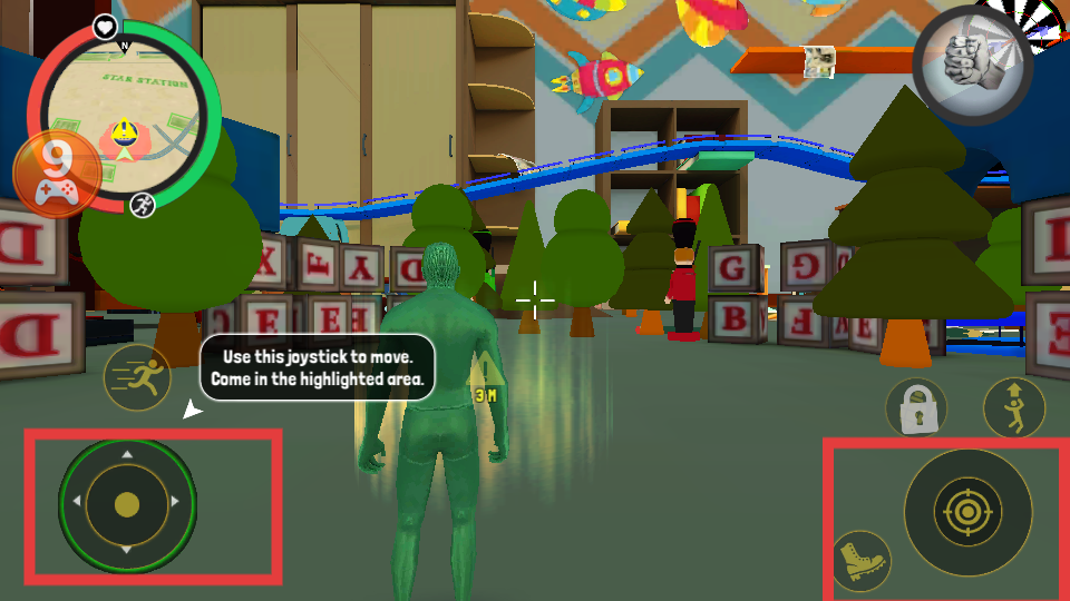 2、游戲中利用左側(cè)搖桿移動角色,右側(cè)按鈕進(jìn)行攻擊等操作,熟悉移動和戰(zhàn)斗的基本操作方式。