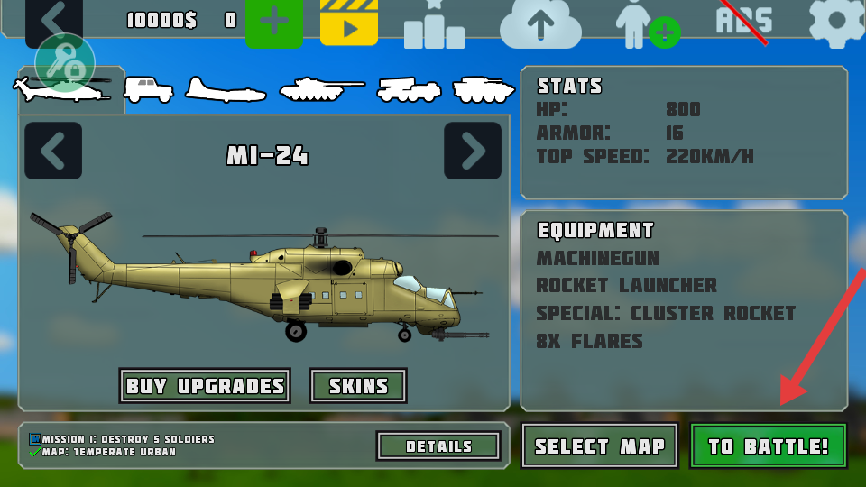 1、選擇MI-24直升機(jī)后,點(diǎn)擊【TOBATTLE!】按鈕進(jìn)入戰(zhàn)斗,開啟直升機(jī)戰(zhàn)斗任務(wù)。