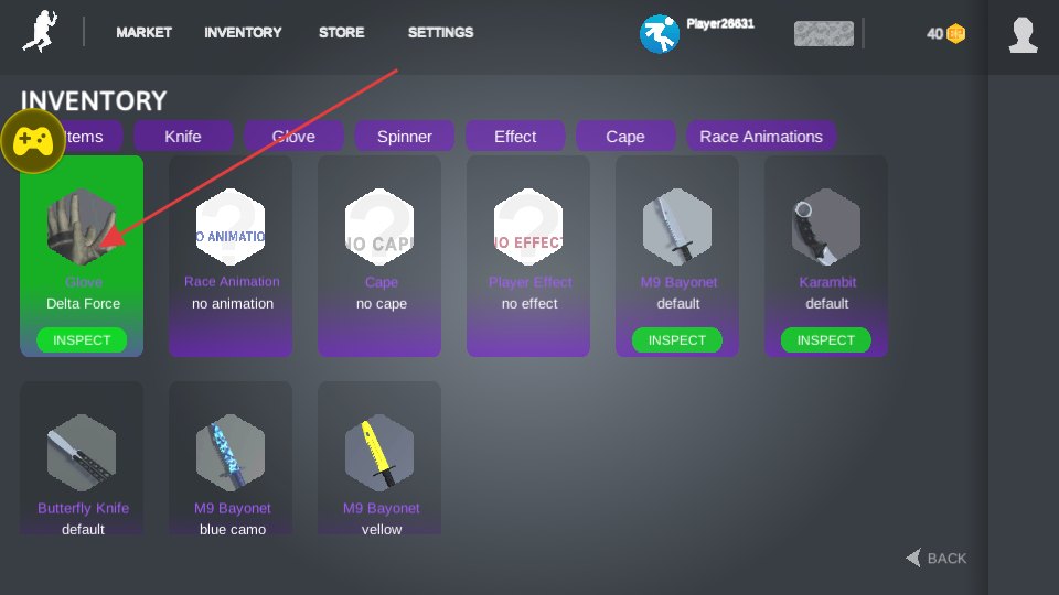 1、在物品欄中可查看和使用手套等裝備,提升角色外觀和個(gè)性化體驗(yàn),點(diǎn)擊【INSPECT】可查看裝備詳情。