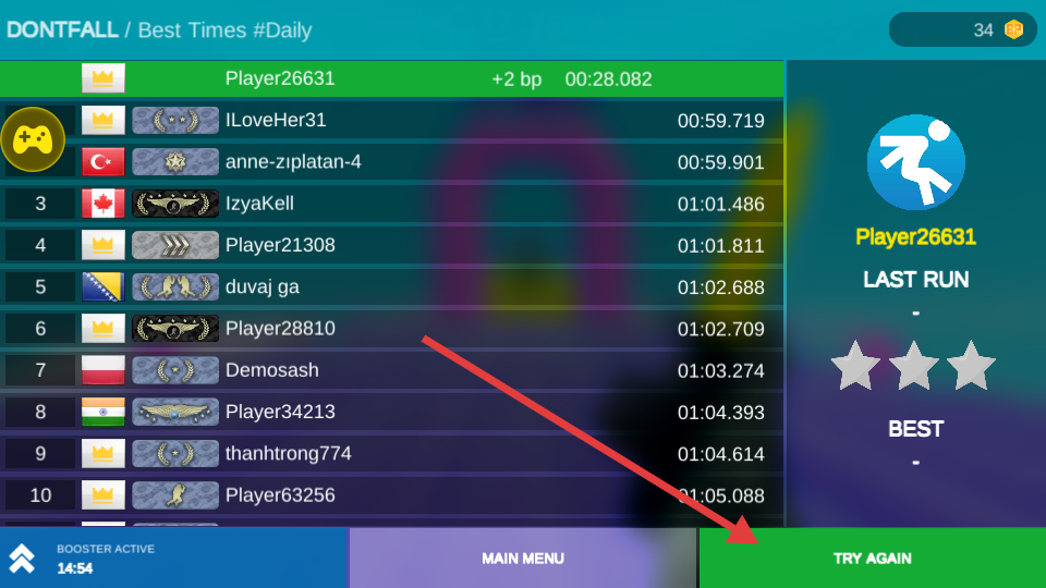 4、若跑酷成績未達(dá)預(yù)期,點(diǎn)擊【TRYAGAIN】重新挑戰(zhàn),總結(jié)經(jīng)驗(yàn),優(yōu)化操作技巧,爭(zhēng)取更好的跑酷成績和排名。
