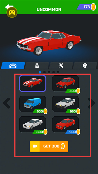 1、在車輛選擇界面,可選擇不同車輛進(jìn)行游戲,部分車輛需花費(fèi)金幣解鎖,也可通過獲取金幣的方式解鎖更多車輛。