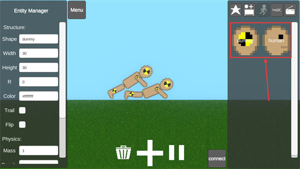 2、通過(guò)右側(cè)欄選擇【dummy】或【human】模型添加到場(chǎng)景,可利用【Entity-Manager】調(diào)整模型參數(shù)。