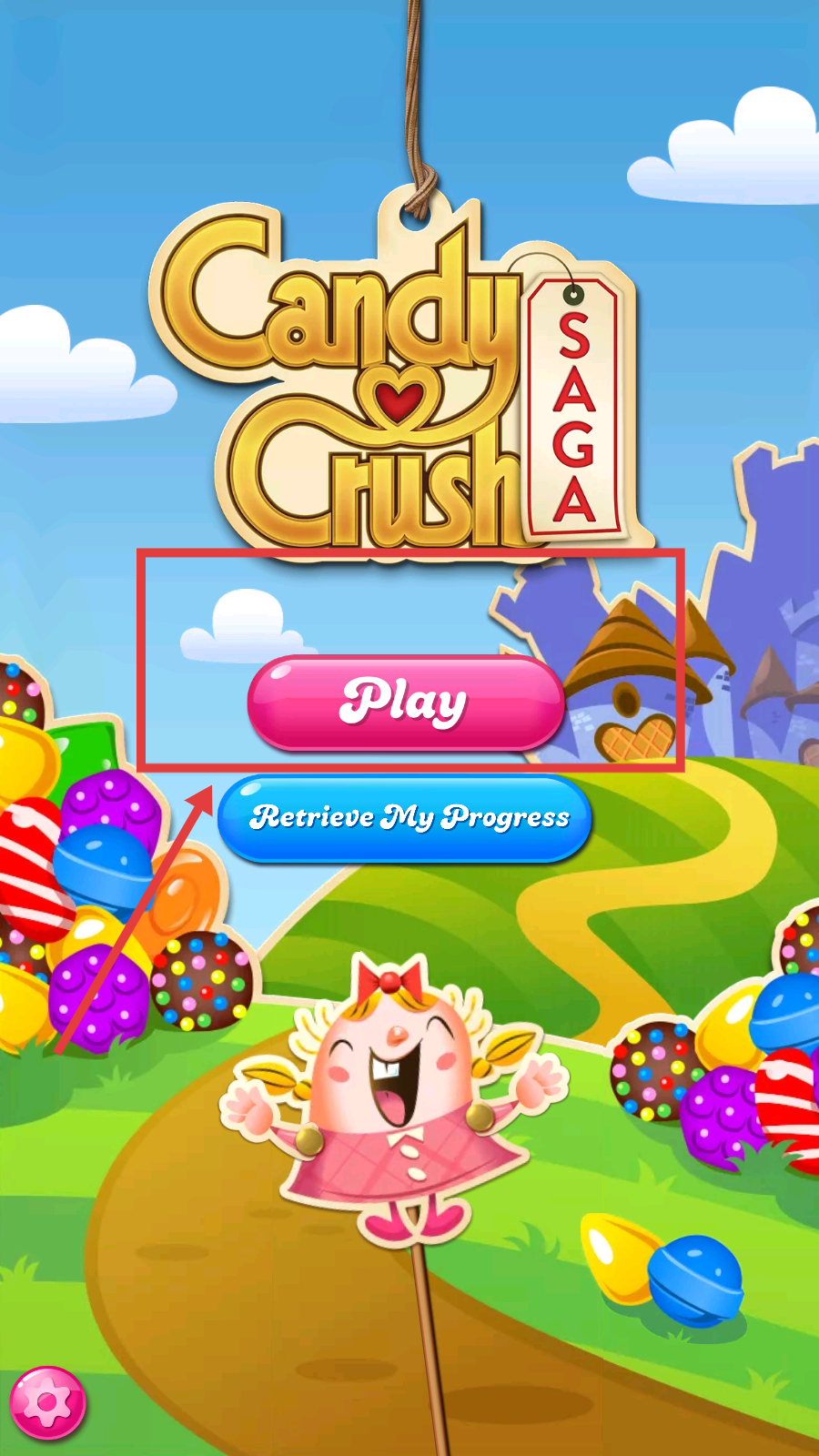 1、進(jìn)入游戲界面,點(diǎn)擊粉色【Play】按鈕開始游戲,也可選擇藍(lán)色按鈕恢復(fù)進(jìn)度,開啟糖果消除之旅。