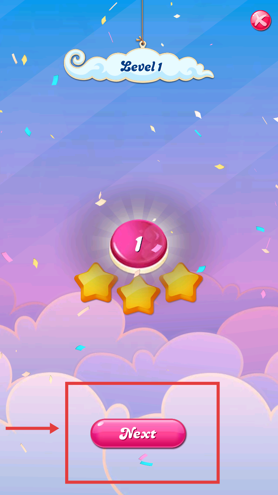 4、關(guān)卡通關(guān)后,界面會(huì)顯示星級(jí)評(píng)價(jià),點(diǎn)擊粉色【Next】按鈕可進(jìn)入下一關(guān),繼續(xù)挑戰(zhàn)更多糖果消除關(guān)卡。
